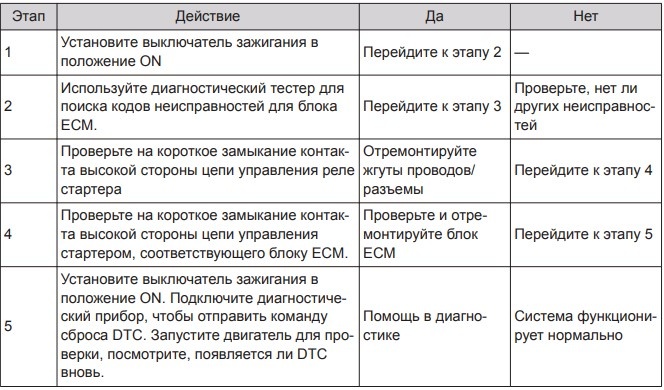 Описание кода неисправности: низкое напряжение в цепи управления реле стартера Условия возникновения кода неисправности: ошибка в ходе самодиагностики.