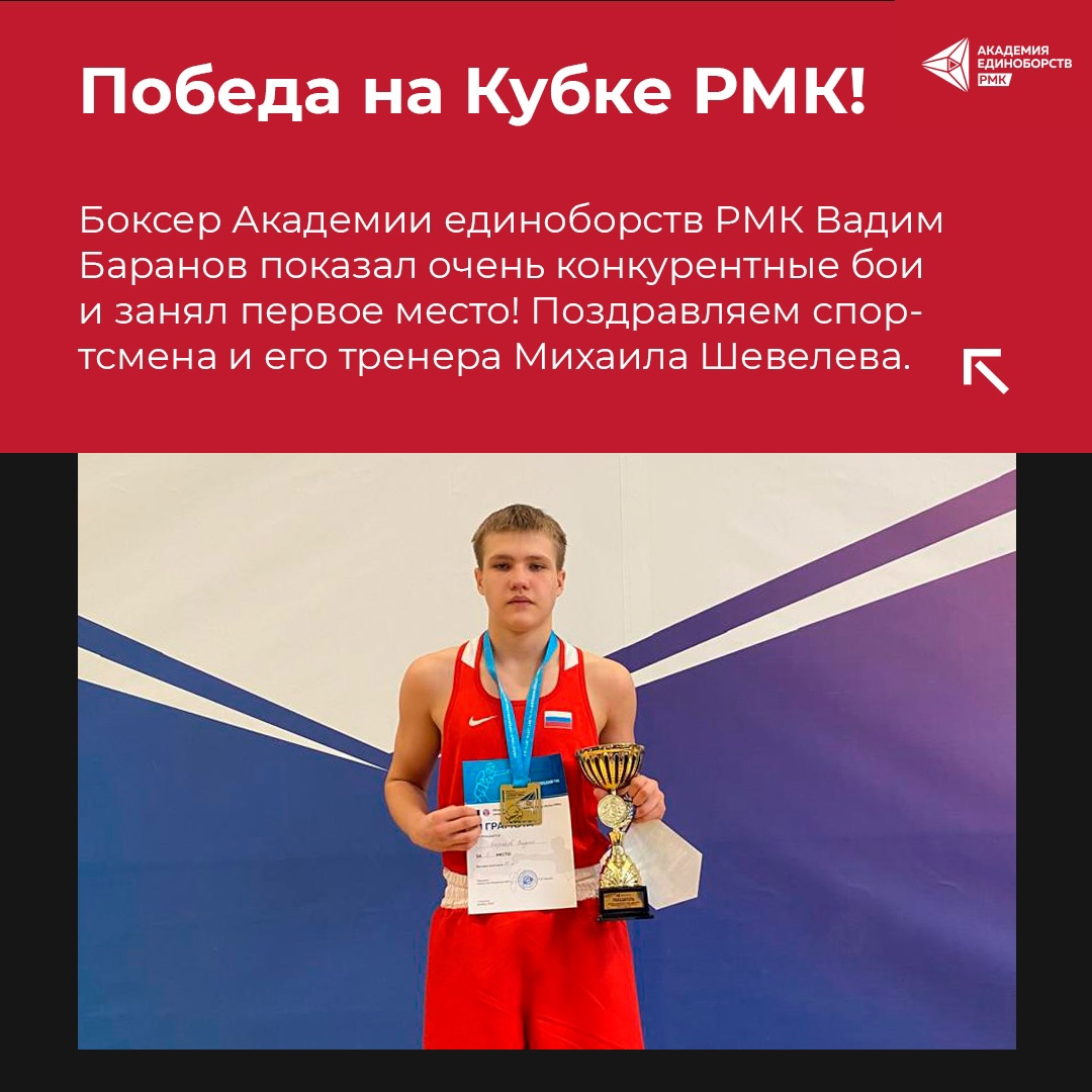 Боксер Академии единоборств РМК Вадим Баранов показал очень конкурентные бои и занял первое место! Поздравляем спортсмена и его тренера Михаила Шевелева.
