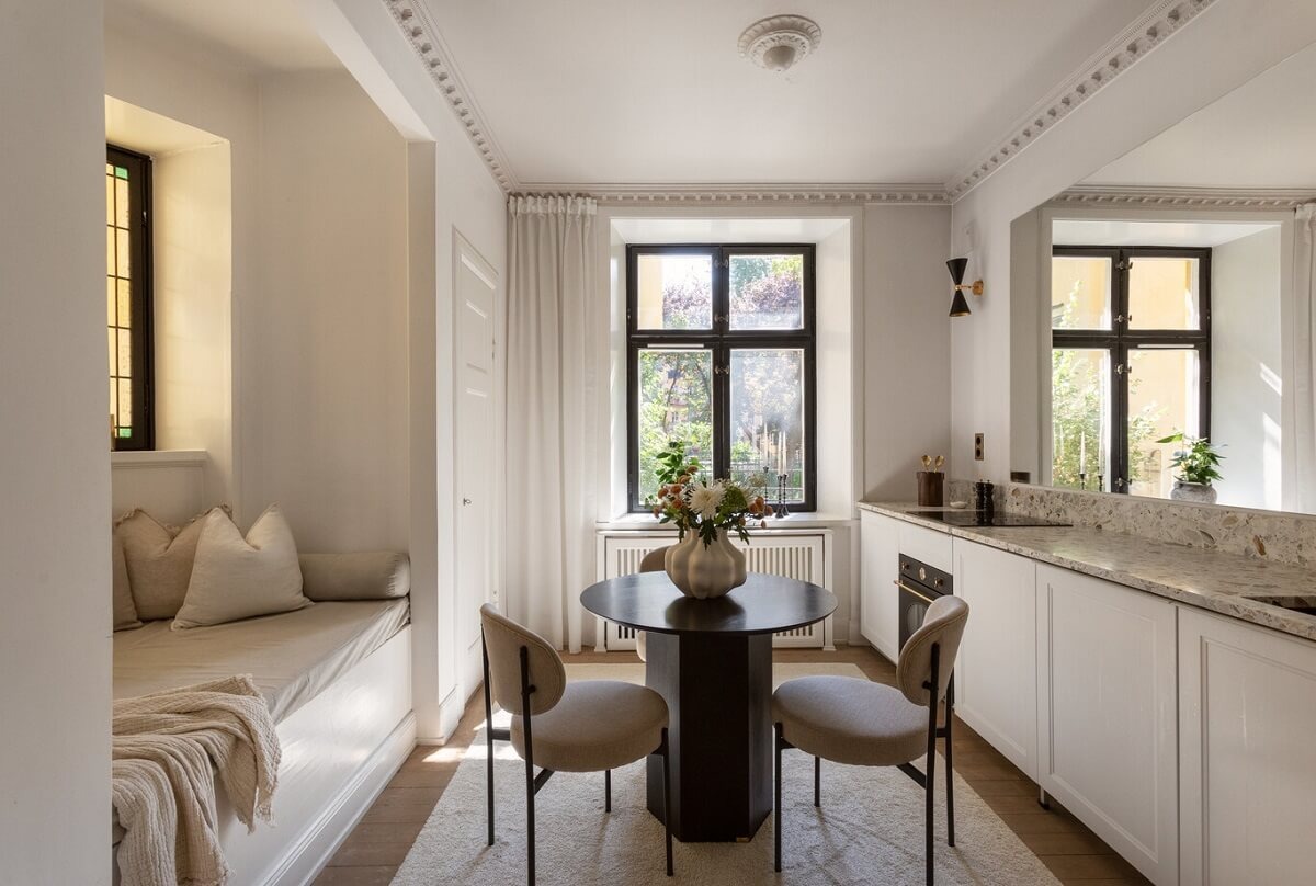 Эта квартира в Стокгольме доказывает, что уют и стиль не зависят от квадратов! На площади всего 29 квадратных метров дизайнеры создали невероятное пространство, наполненное светом, минимализмом и продуманной функциональностью. Построенная на рубеже веков, квартира сохранила очарование старины: оригинальные полы, окна, лепнина, глубокие ниши и высокие потолки. Но современный интерьер – это совсем другая история! Светлая цветовая палитра визуально расширяет пространство, а большое зеркало в гостиной создаёт иллюзию ещё большей площади. Встроенные системы хранения и тщательно подобранная мебель делают квартиру невероятно стильной и аккуратной. Коридор делит пространство на две зоны – гостиную с кухней открытой планировки и уютную спальню. Кухня радует светлыми шкафами и практичной столешницей из камня Granitop. Большое зеркало над рабочей зоной – гениальный дизайнерский ход, который делает кухню светлее и просторнее. Спальня, хотя и небольшая, уютна и функциональна благодаря вс