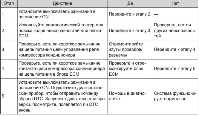 Описание кода неисправности: высокое напряжение в цепи реле компрессора кондиционера. Условия возникновения кода неисправности: ошибка в ходе самодиагностики.
