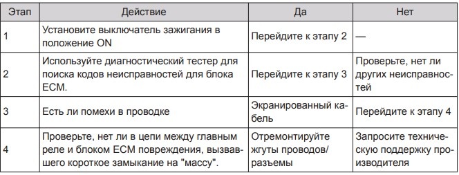Описание кода неисправности: короткое замыкание на "массу" главного реле. Условия появления кода неисправности: короткое замыкание на "массу" главного реле на этапе включения питания блока ECM.