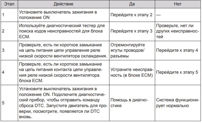 - Короткое замыкание на цепь питания цепи управления реле низкой скорости вентилятора охлаждения.
