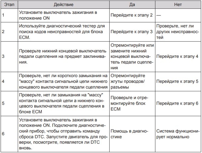 Определение кода неисправности: заклинен нижний концевой выключатель педали сцепления. Условия появления кода неисправности: сигнал нижнего концевого выключателя педали сцепления не изменяется.