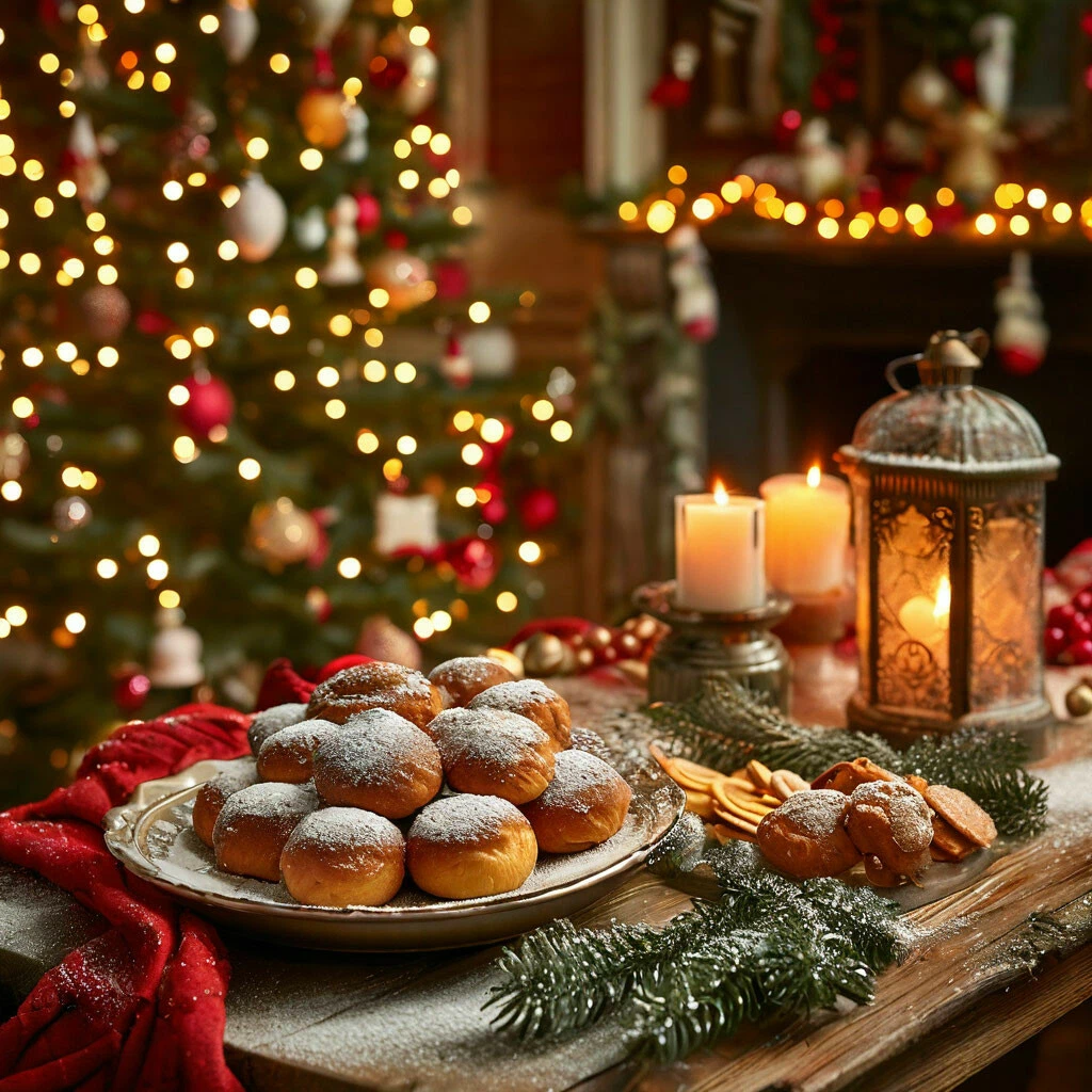 Традиционное новогоднее блюдо из Голландии. Ингредиенты: · дрожжи сухие – 5 гр.; · сахар – 1 ч.л.; · вода тёплая – ½ ст.; · яйцо – 1 шт.; · мука – около 500 гр.; · молоко тёплое – 200 мл.; · изюм – 150 гр.; · ягодный сироп (или сироп от варенья) – 2 ст.л.; · цукаты – 1, 5 ст.л.; · соль – 1 щепотка; · масло для фритюра; · сахарная пудра для посыпки. Приготовление: цукаты мелко порезать, изюм залить горячей водой, муку просеять. Сахар развести в воде, добавить дрожжи, дать подойти в тёплом месте в течение 30 минут. Яйцо, молоко, изюм, цукаты, сироп смешать, добавить разведённые дрожжи. Аккуратно перемешать, добавить муку, соль. Вымешивать тесто в течение 2-3 минут до состояния густой однородной массы, которая стекает с ложки, при необходимости добавить ложку муки или тёплого молока, чтобы отрегулировать консистенцию. Накрыть миску с тестом пищевой плёнкой и оставить на 2 часа в тёплом месте. В кастрюле с толстым дном разогреть масло, сформировать небольшие шарики (мокрыми руками или с по