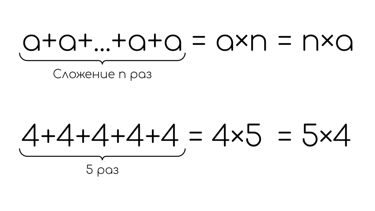 Умножение — это сложение одного и того же числа несколько раз. Один сомножитель — это число, которое складываем. Второй — это сколько раз складываем первый сомножитель. Сомножители можно менять местами, произведение не изменится.