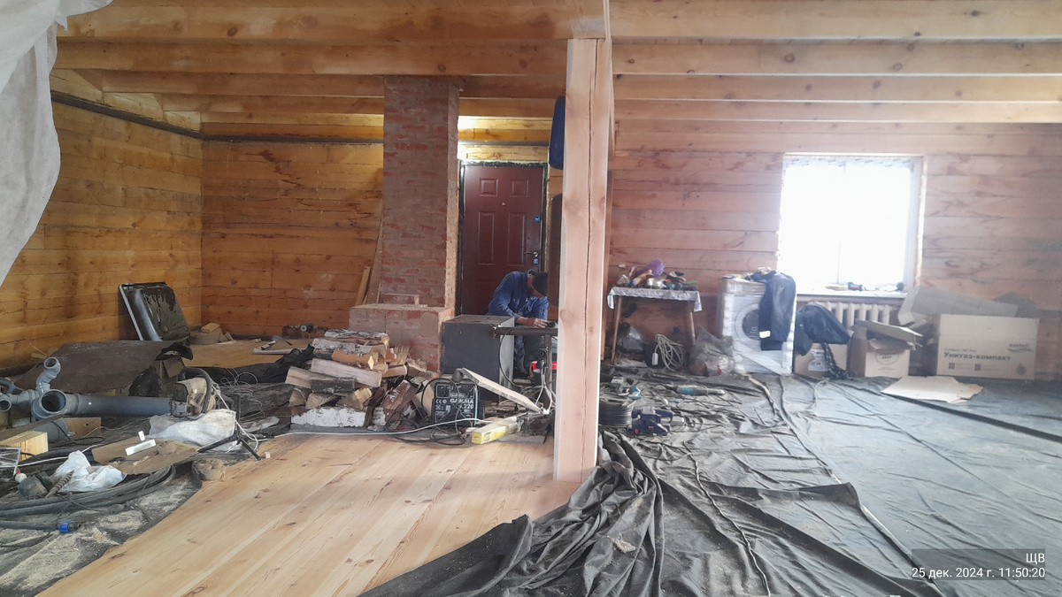 Начнем опять вот с этой фотографии. Такой вот вид был с утра двадцать пятого числа, когда мы в Дом пришли. Я встала, огляделась. Совсем не понятно,что делать и с чего начинать. Работы неначатый край))) Всем здравствовать долго и счастливо!!! 25 декабря Супружник там с чем то копается, у него свои дела, свои планы. Он потихоньку одно за другим делает и делает. Любину комнату дошлифовали. Разница большая между шлифованным брусом и который не трогали. Да там еще и грязь какая то была на стенах. И когда варили отопление, копоть была. Страшно было. Теперь хорошо. Не тот цвет,как верхние брусья и потолок, но все равно. Потом, когда нибудь зимой, перегородки поставим и все. Ну а так то доделок много еще. Это уже по ходу пьесы. Растянем на годА)))) Правильно многие мои любимые читатели - писатели писали. На годА это все растянется. Да и пусть. Даже у тех, у кого вроде бы, на первый взгляд, все сделано под ключ, и даже не под один, все равно начинают то столики передвигать, то уголочки перекр