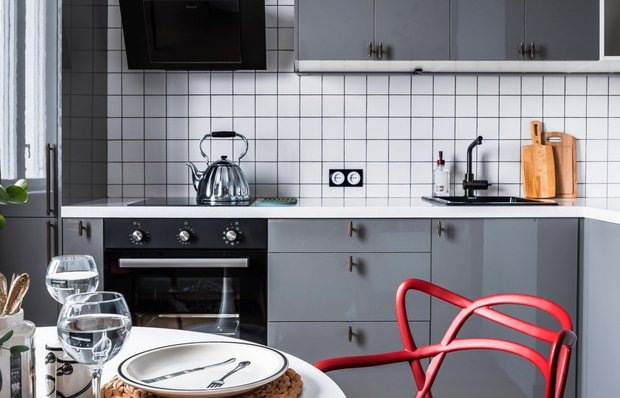 Интерьер, в котором каждая деталь продумана до мелочей На примере проекта дизайнера Алены Власовой показываем, какой яркой, стильной и функциональной может быть кухня в типовой квартире. Для отделки выбрали антивандальные материалы. Стеклообои с рисунком «диагональ» покрыли светло-голубой краской, на полу уложили кварцвиниловое покрытие. Фартук облицевали квадратной плиткой, которую сочетали с серой затиркой в тон фасадам шкафов. Кухонный гарнитур покупали готовый. Фасады дополнили красивыми и тяжелыми латунными ручками бронзового цвета, которые украсили всю кухню. Встроенную технику, мойку и смеситель выбрали черные. За фасадами и в выдвижных ящиках достаточно мест для хранения, есть открытые полки для книг с рецептами, красивой посуды или декора. Столовую зону оформили по образу яркого кафе. Стену за диваном сделали акцентной с помощью арочных конструкций из МДФ, с которыми перекликаются стулья. Их дополнили стильными бра — они смотрятся оригинально и выразительно. В интерьере кухни