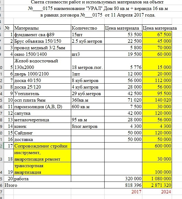 К примеру фундамент из винтовых свай почти не подорожал. А прошло семь лет! Общестроительные материалы, как метал и дерево подорожали в два раза. Рост был более менее без рывков. А вот к примеру проводка уже не тупа раскидывается строителями, а монтируется по 200 рублей за погонный метр провода, плюс сборка щитка в 20 тысяч. (материалы отдельно).