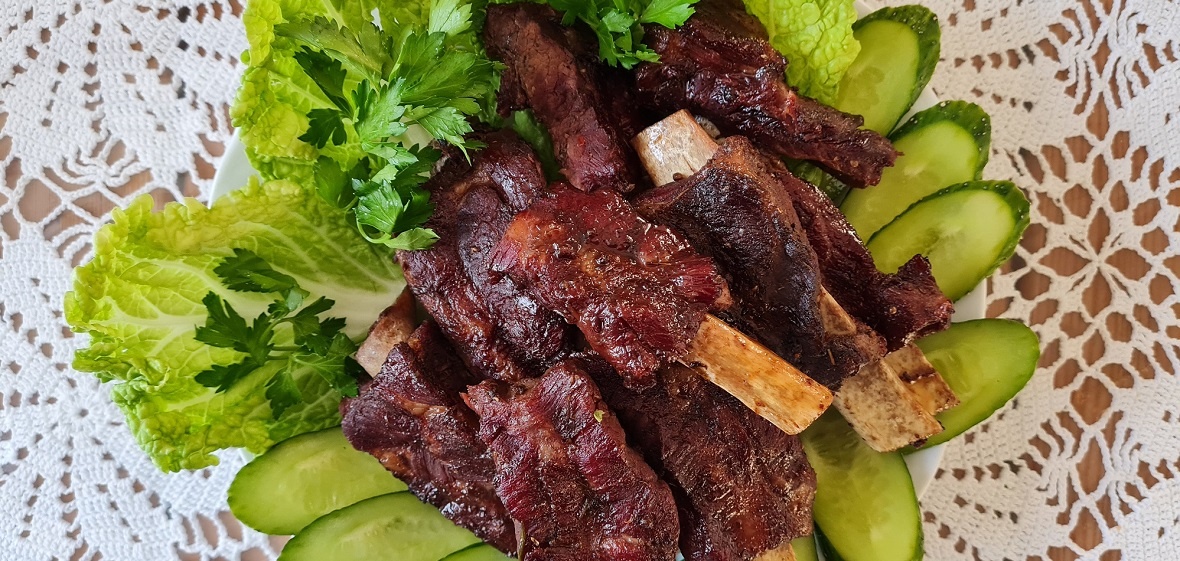 Когда мясо будет готово, достаньте его из бульона и разложите на блюде. Пусть рёбрышки полежат, чтобы подсохли естественным путем.