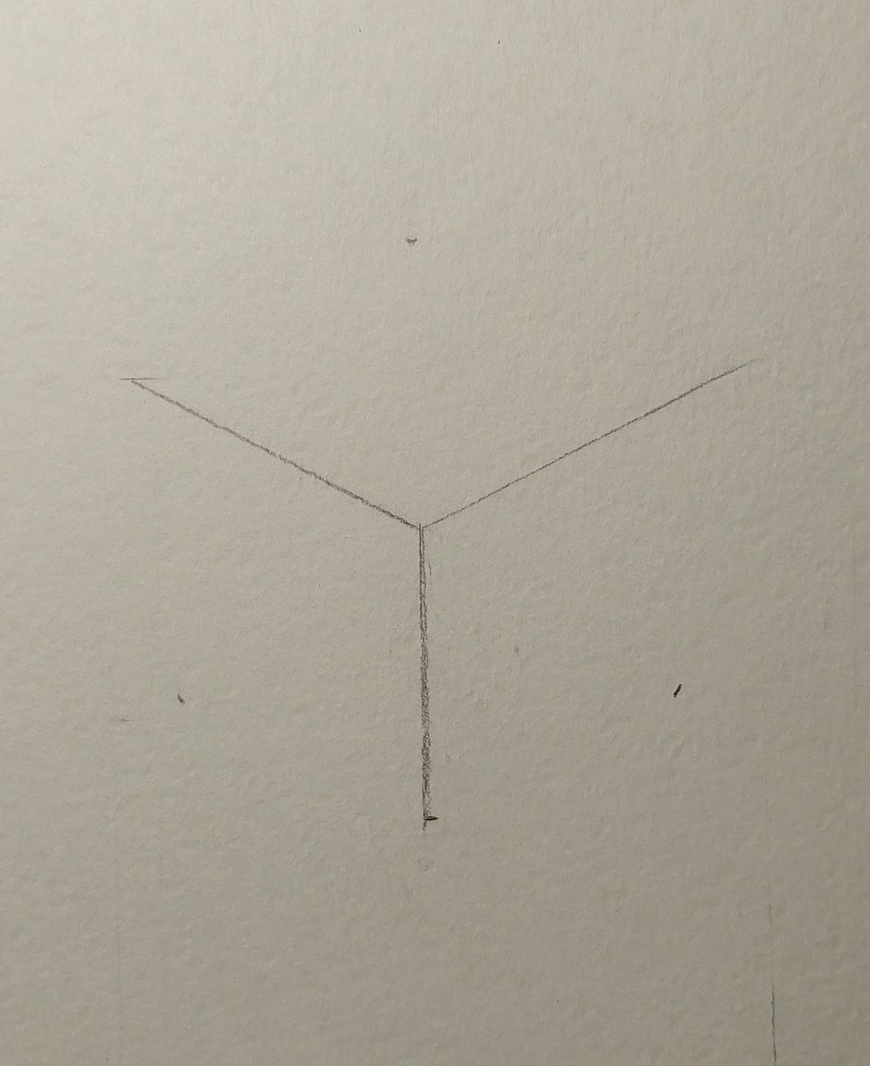 Нарисуем небольшую новогоднюю открытку с композицией из ёлочных игрушек. Первая и центральная часть будет состоять из игрушки-звездочки. 1. Для начала сделаем разметку эскиза, нарисовав трехконечную звезду с двумя лучами, направленными вверх, и одним – вниз. Длина лучей будет составлять 4 см. От центра также отметим еще три луча в промежутках, но их полностью прорисовывать не будем, а лишь отметим край. Он будет расположен на расстояние 3,5 см от центра. 2. На более длинных лучах нарисуем крупные листочки. На отмеренных отрезках, длинной 3,5 см, нарисуем небольшие листики с длинными ножками-веточками. 3. В свободные места (но только с одной стороны от маленького листочка) нарисуем ягодки (1-2 штучки). С другой стороны, нарисуем веточки с несколькими ответвлениями. 4. Смешав темный зеленый и синий, получим цвет, которым нарисуем крупные резные листья. 5. Добавив в цвет из 4 пункта больше синего, получим оттенок, которым нарисуем мелкие листья с длинными ножками. 6. Насыщенным бордовым