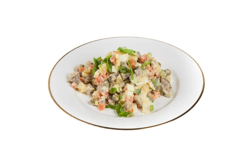 Знаменитый салат, без которого не обходится ни один праздничный стол. Оригинальный рецепт история не сохранила, так что теперь вариантов оливье столько же, сколько семей, и каждый из них замечателен по-своему. Попробуйте и наш способ. Ингредиенты Говядина 300 г Картофель 400 г Морковь 3 штуки Репчатый лук 1 головка Соленые огурцы 3 штуки Огурцы 2 штуки Зеленый горошек 1 банка Зеленый лук по вкусу Майонез по вкусу Соль по вкусу Молотый черный перец по вкусу Куриное яйцо 3 штуки 1.Подготовить необходимые ингредиенты. 2.Отварить говядину в подсоленной воде.. 3.Отдельно сварить картошку и морковь. 4.Отварить яйца. 5.Отваренное мясо нарезать мелким кубиком. 6.Очистить и нарезать яйца. 7.Овощи также нарезать мелким кубиком. Для красоты и гармонии ингредиенты нужно нарезать кубиками одного размера. 8.Перемешать все подготовленные ингредиенты силиконовой лопаткой, чтобы не разрушить их форму. 9.Добавить майонез, посолить и поперчить по вкус . 10.Горошек добавить в самом конце, перед подачей