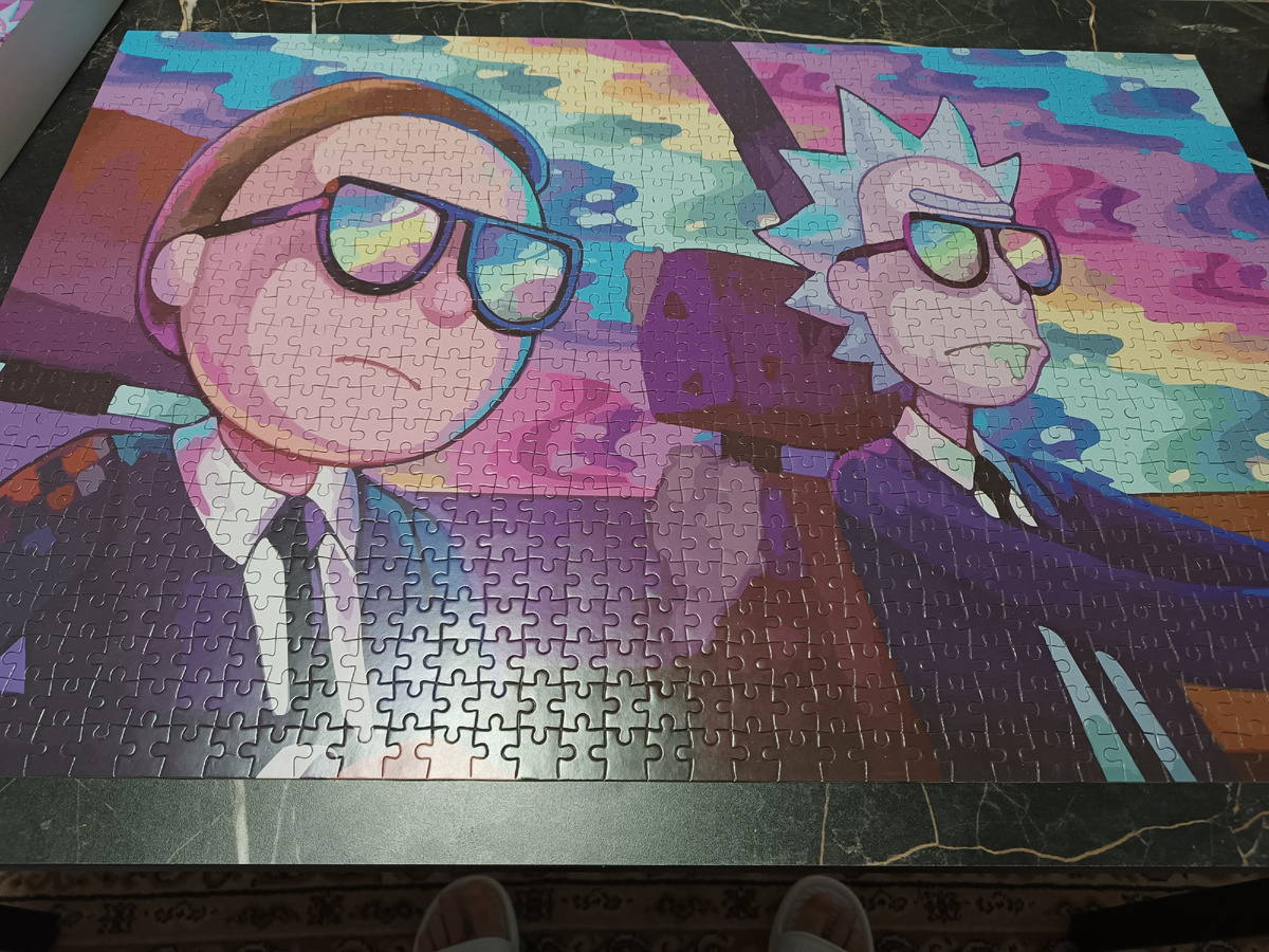 Спойлер: если у вас тоже есть желание прям сейчас скрепить картину-пазл, то покрыть её клеем ПВА - идея ужасная! Прежде чем портить пазл, который был самым большим в моей жизни (первый опыт сборки на 1000 деталей), я прочитала советы в интернете. Было написано,что лучше всего использовать клей для пазлов, но у меня такого не оказалось. Вторым хорошим вариантом был ПВА с хорошим сроком годности. Мне повезло, мой клей был свежайший. Не знаю, почему я не поискала ещё статьи в подтверждение данного варианта. Было описано несколько вариаций: 1) перевернуть весь пазл и склеить детали посредством двп или плотного картона; 2) перетащить пазл на лист бумаги и просто покрыть клеем, тщательно напихав состав в стыки деталей. Второй вариант показался мне более лёгким в выполнении. С помощью малярного скотча я укрепила пазл. Первой трудностью было то, что без малярного скотча лист бумаги не заползал, а цеплялся за стыки. Малярный скотч не трудно снять, придерживая второй рукой место отсоединени