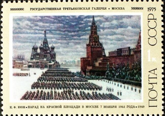 Художник К.Ф. Юон (1875-1958) решил написать картину, посвящённую легендарному Параду и тем самым оставить в памяти поколений это событие. Над этим полотном художник работал целый год. Работа была закончена в 1942 году. Название картины «Парад на Красной Площади в Москве 7 ноября 1941 года».