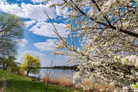 Весна… Любоваться округой нет возможности, слишком уж интенсивное движение на трассе. Многочисленные перегруженные фуры, различные грузовики, но и просто легковых автомобилей – сплошной поток. Всё же остановилась на обочине полюбоваться небольшим озерцом окружённым цветущими деревьями. Не удержалась, сделала несколько фотографий и со счастливой улыбкой отправилась в путь.