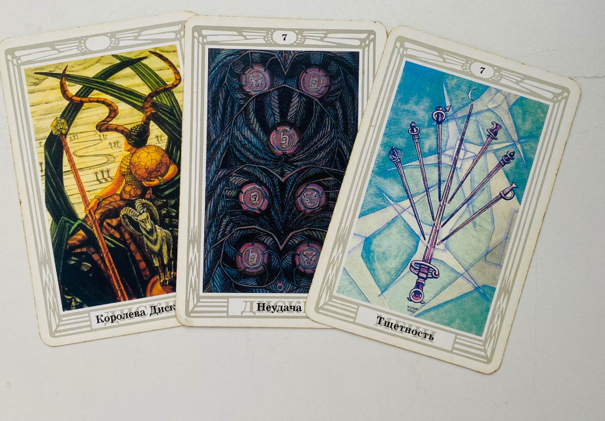 Выпал интересный расклад: Королева Пентаклей, Семерка Пентаклей и Семерка Мечей. Не переживайте, все не так страшно, как может показаться на первый взгляд. Итак, по порядку!