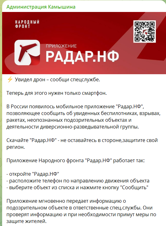 Первой с призывом к гражданам накануне обратилась администрация Камышина: «Увидел дрон — сообщи спецслужбе». В тг-канале муниципалитета пояснили, что в России официально запущено мобильное приложение «Радар.НФ». Граждан призывают скачать его и при помощи него оперативно сообщать о беспилотниках, взрывах, ракетах, неопознанных подозрительных объектах и деятельности диверсионно-разведывательной группы. В сообщении администрации взывают к патриотизму: