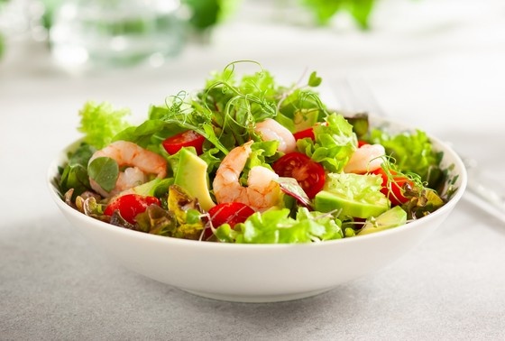Возьмите 300 г вареных креветок, авокадо, пучок листьев салата, 200 г помидоров черри, столовую ложку лимонного сока, две столовые ложки оливкового масла, соль и перец по вкусу.