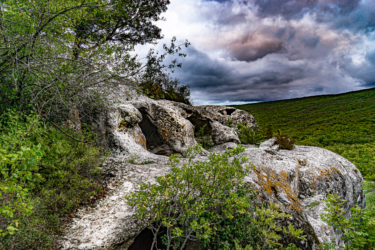 Древние города-крепости Крыма. Пещерный Эски-Кермен пасмурный. Фото в осенних тонах.