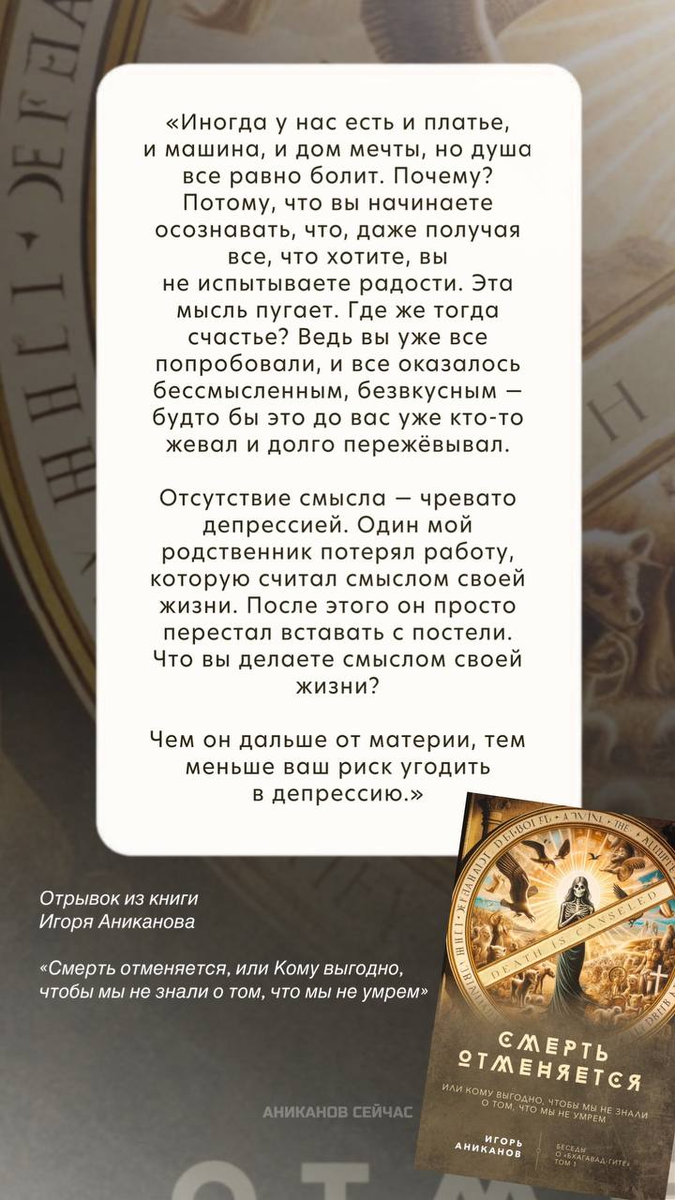 ...Иногда у нас есть и платье, и машина, и дом мечты, но душа все равно болит. Почему? Потому, что вы начинаете осознавать, что, даже получая все, что хотите, вы не испытываете радости. Эта мысль пугает. Где же тогда счастье? Ведь вы уже все попробовали, и все оказалось бессмысленным, безвкусным — будто бы это до вас уже кто-то жевал и долго пережёвывал. Отсутствие смысла — чревато депрессией. Один мой родственник потерял работу, которую считал смыслом своей жизни. После этого он просто перестал вставать с постели. Что вы делаете смыслом своей жизни? Чем он дальше от материи, тем меньше ваш риск угодить в депрессию... Отрывок из книги Игоря Аниканова "СМЕРТЬ ОТМЕНЯЕТСЯ или кому выгодно, чтобы мы не знали о том, что мы не умрем"