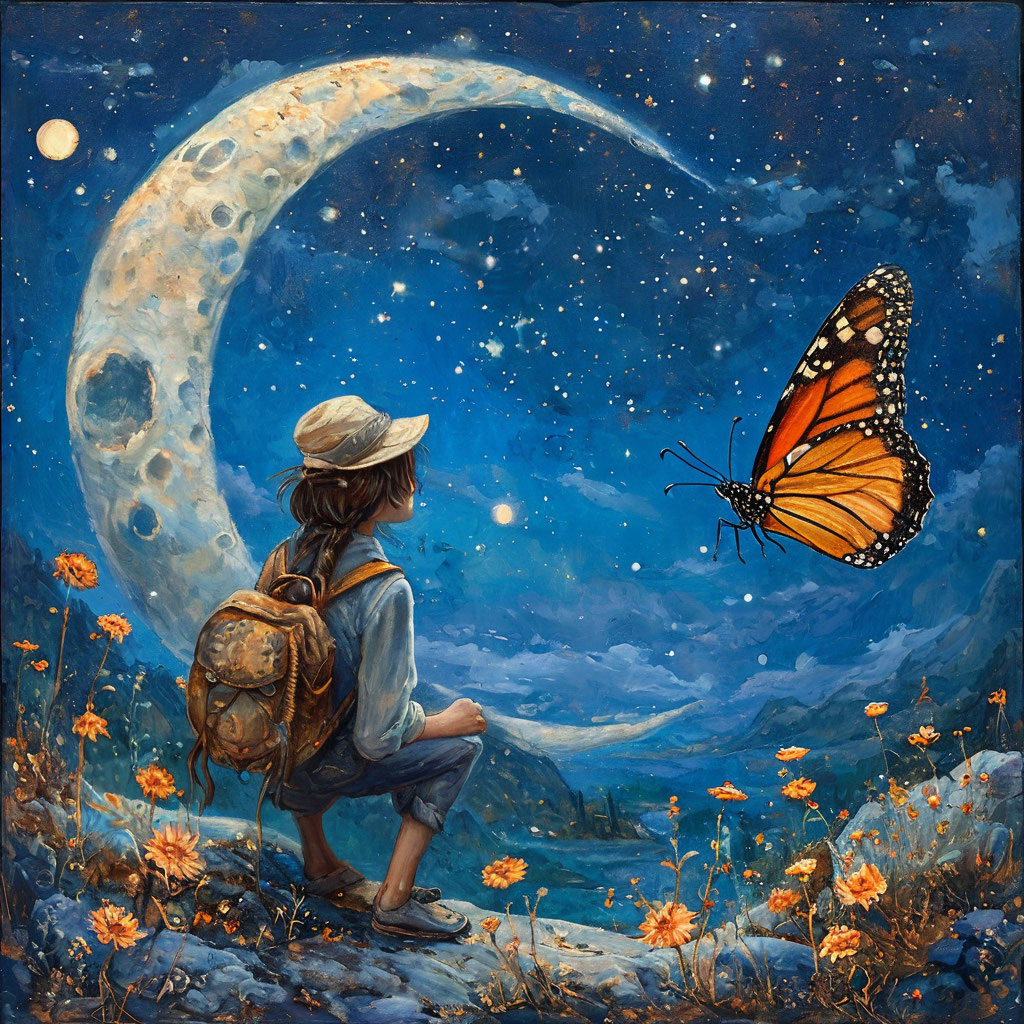 В далекой-далекой стране, где леса были всегда зелеными, а реки текли кристально чистыми потоками, жил-был юный путешественник по имени Алан. Он мечтал о далеких землях и искал приключения, которые могли бы открыть ему тайны жизни. Однажды, во время вечерней прогулки, Алан заметил удивительное свечение в лесу. Подойдя ближе, он увидел Лунную Бабочку — необычайно красивое создание с крыльями, переливающимися всеми цветами радуги. Она танцевала в воздухе, оставляя за собой следы света. — Здравствуй, Алан! — сказала Бабочка. — Я пришла, чтобы показать тебе миры, о которых ты мечтаешь. Но для этого тебе нужно выполнить три испытания. Алан, полный решимости, согласился. Первое испытание заключалось в том, чтобы найти Золотую Яблоню, которая росла на самой высокой горе леса. Он поднялся на гору и увидел, как яблоня светится на его вершине. Но чтобы достать яблоко с дерева, нужно было проявить терпение и осторожность. Алан медленно и аккуратно поднялся, и, наконец, сорвал плод. Яблоко освети