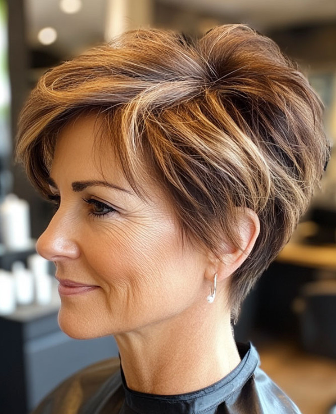 Кассическая стрижка пикси с медовыми блондированными прядями идеально подходит для женщин 50+ лет. Гладкие слои добавляют объем и текстуру, а теплые пряди придают сияющий блеск всему образу.