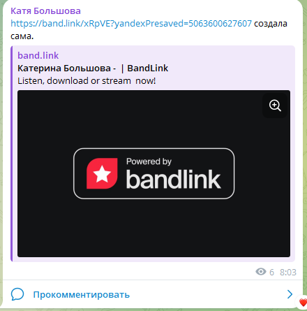 Сама создала этот бандлинк! Ведёт на нашу с Полиной Бариновой песню "Я любила Джо". Кому интересно, кликайте. А это скан с моего канала на телеге: https://t.me/katBolhay ___________________ Вы слушаете музыку на этих сайтах? На Яндекс музыке слушаю 20 000 000 - и 15 000 000 по подписке. В этом году Яндекс музыка заработала на это 200 миллиардов рублей. Представляете, сколько зарабатывают там исполните, у которых больше 1 000 000 слушателе?