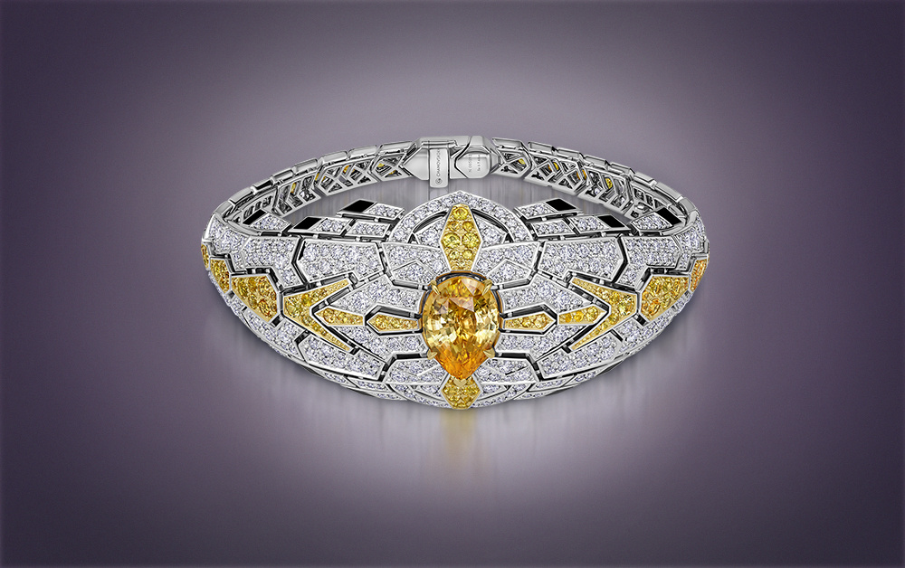 Блистательные украшения вдохновлены символом Сингапура, мифическим полульвом-полурыбой. Первый образ олицетворяет силу и отвагу, второй — передает тесную связь города-государства c морем, ведь изначально «Львиный город», являющийся сейчас одним из крупнейших мегаполисов, был всего лишь рыбацкой деревней. Сингапур завораживает сочетанием красок, игрой света и пространства. Именно поэтому солирующим элементом браслета «Мерлион» был выбран фантазийный сапфир оттенка Vivid Yellow no heat весом 7,68 ct. Его насыщенный солнечный цвет подчеркнут роскошным геометричным орнаментом с инкрустацией 351 бриллиантом, 101 желтым сапфиром и контрастной черной ювелирной керамикой. Невероятно эффектный браслет «Мерлион» соединяет в себе технологичность, динамику азиатского мегаполиса, аутентичность и связь с традициями.