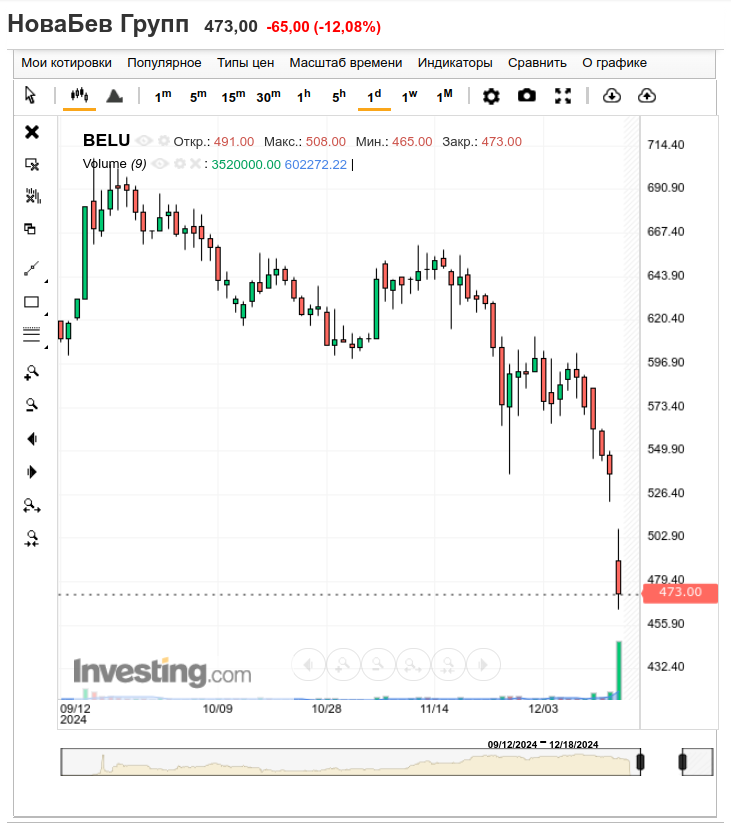 6 декабря 2024 года акции компании Новабев были разблокированы и начали торговаться на Московской бирже в полном объеме. В результате первых торгов после разблокировки акции производителя алкоголя упали на 13,6%, достигнув минимальной отметки в 460 рублей. Однако к середине дня падение замедлилось, и сейчас котировки составляют 473 рубля (-12,08%), что все же остается значительно ниже прежних уровней. Основной причиной такого резкого падения стало поступление на рынок дополнительных акций, которые инвесторы получили в рамках увеличения капитала компании. Дробление акций происходило по коэффициенту один к восьми. Это означает, что за каждую акцию, которая была доступна для торговли, акционеры получили еще семь, которые были временно заблокированы. Теперь, когда эти дополнительные акции поступили на счета брокерских компаний, многие инвесторы начали распродажу своих позиций, что и привело к обвалу котировок. Это может вызвать не только краткосрочное падение котировок, но и долгосрочные п