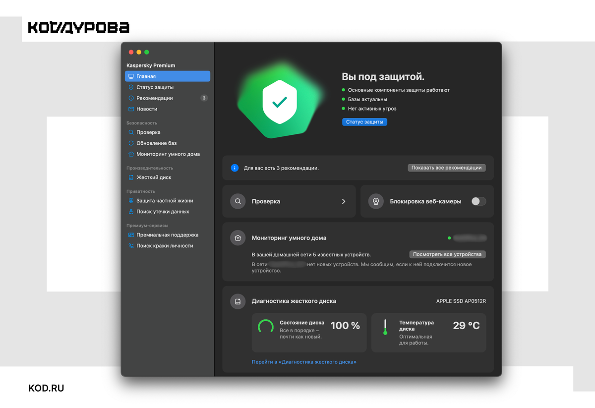 Не стоит забывать и о киберугрозах, которые вообще не зависят от операционной системы. Открыть фишинговую ссылку может и опытный пользователь, поскольку не все поддельные сообщения можно распознать невооружённым глазом. Особенно это актуально для Telegram — люди, к сожалению, действительно попадаются на уловки злоумышленников. От всех этих угроз защищают решения линейки Kaspersky, один из тарифных планов которой был удостоен награды «Лучшее защитное решение для macOS» от независимой исследовательской лаборатории AV-TEST. Мы рассмотрим фичи на примере самого продвинутого плана линейки — Kaspersky Premium.