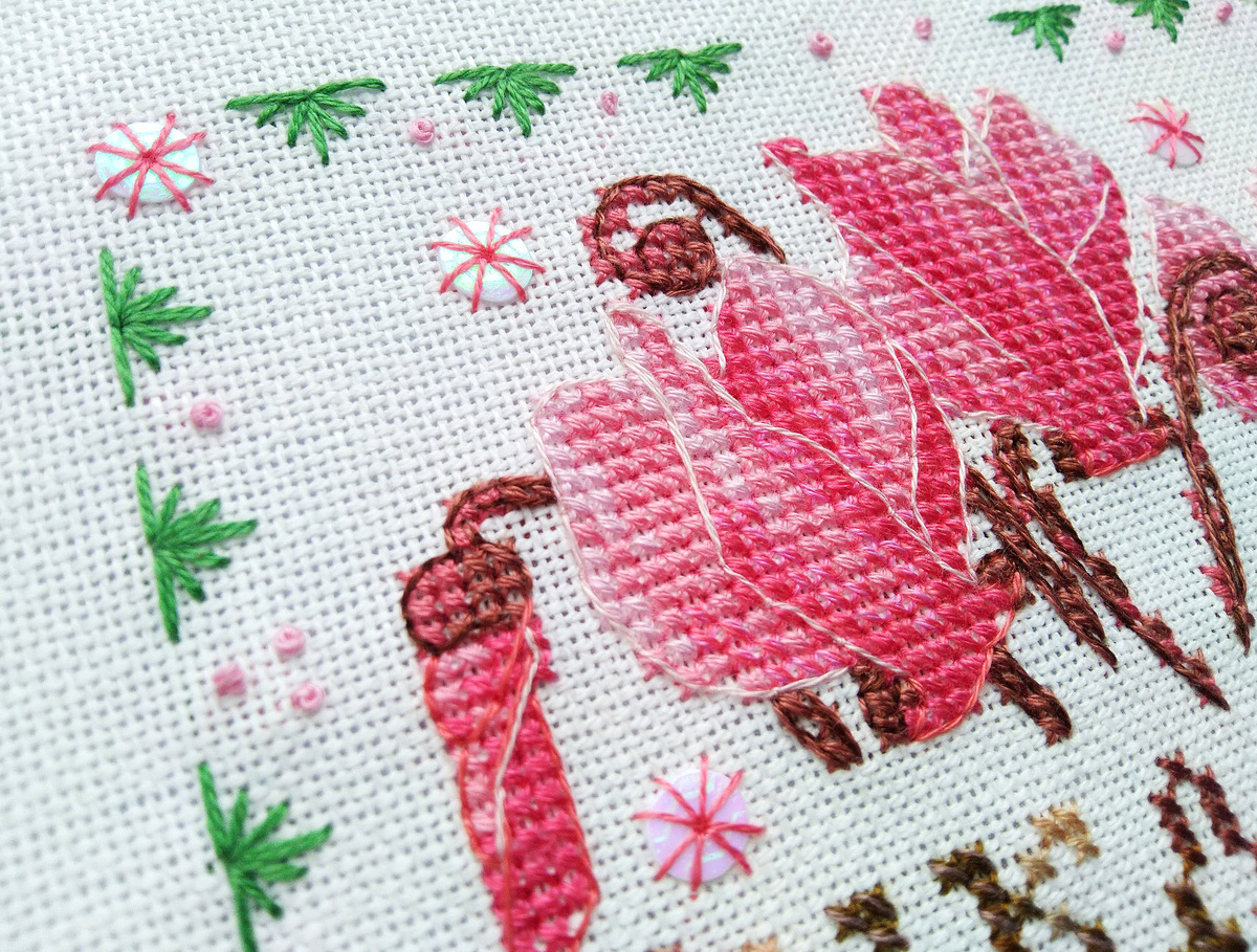 Прежде всего, на каждом моём фото очертания лепестков цикламена светлые, почти белые, поэтому большую часть этого бэкстича я вышила бледно-розовым, а верхушки лепестков — ещё более светлым оттенком. Бэкстич в нижней части цветков выполнен розово-коралловой нитью. Стебелькам я не смогла сразу найти удачную обводку, первый вариант показался слишком тёмным и отвлекающим внимание от нежных цветочков, но распускать я стежки не стала и просто где рядом, а где поверх них вышила более светлые линии. :Р
