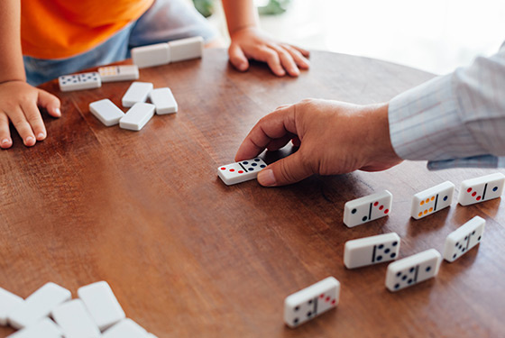 Настольные игры – отличный вариант для всестороннего развития ребенка, родителей и семейной коммуникации. На счастье современного человека выбор таких игр сейчас огромен! Но это не мешает иногда обращаться к классике. Предлагаю вам поиграть в домино. Домино – увлекательная игра с простыми правилами и достаточно быстрыми партиями, что в адаптированном варианте позволяет в неё играть детям порой уже с 3х лет. Адаптированное для детей домино — это то, в котором точки на костяшках заменены рисунками животных, фруктов т.д. При этом рисунки могут содержать в себе количественный подтекст (один кот, две собаки, три курицы) или нет (все изображения в единичном виде). Суть игры в том, чтобы строить цепочку, подкладывая костяшки с тем рисунком (числом), которое есть у крайних костяшек. Иначе говоря, игроку нужно проанализировать игровое поле, выделив доступные для хода изображения и далее, сравнить их с теми изображениями, что на руках у самого игрока и, в итоге, выбрать ход. При освоении правил