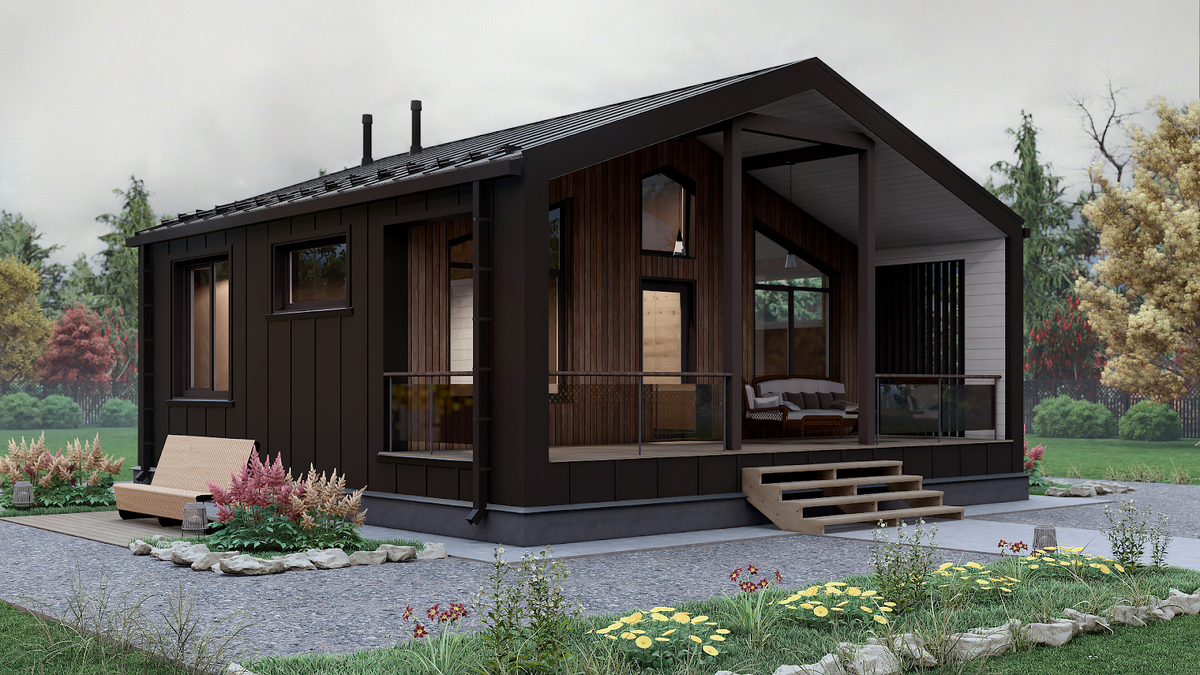Обзор проекта каркасного одноэтажного дома «Глизе 74» Сегодня рассказываем про проект одноэтажного каркасного деревянного дома с просторной крытой террасой. Проект называется «Глизе 74», он разработан компанией «Комплексное загородное строительство». Этот проект выбирают пары или небольшие семьи, а также в качестве гостевого дома или дома выходного дня. Площадь застройки — меньше одной сотки. Дом подходит даже для маленьких участков. Но компактные дома выбирают и владельцы просторных участков, когда хочется сохранить максимум природы, открытого пространства или взрослых деревьев, если участок находится в лесистой местности. Дом облицован по фронтонам имитацией бруса, а по бокам дома отделка повторяет материал кровли — фальцевые панели. Дом не выделяется на фоне природного ландшафта, а гармонично сочетается с ним. В отделке много натурального дерева: сухая строганная доска для переднего и тыльного фасада, имитация бруса, на террасе предполагается палубная обработанная доска из лиственни