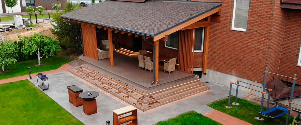 На террасе, взятой для примера, воплощены интересные конструкционные идеи, оригинальное и продуманное зонирование и вовлечены все моменты, влияющие именно на надежность террасы из ДПК. Мы не стали рассказывать вам про базовые основы, как сделать надежный настил из ДПК или натуральной лиственницы, о которых есть в других наших статьях. Мы решили вас вдохновить на создание особенных террас и рассказать о фишках, которые мало кому известны.