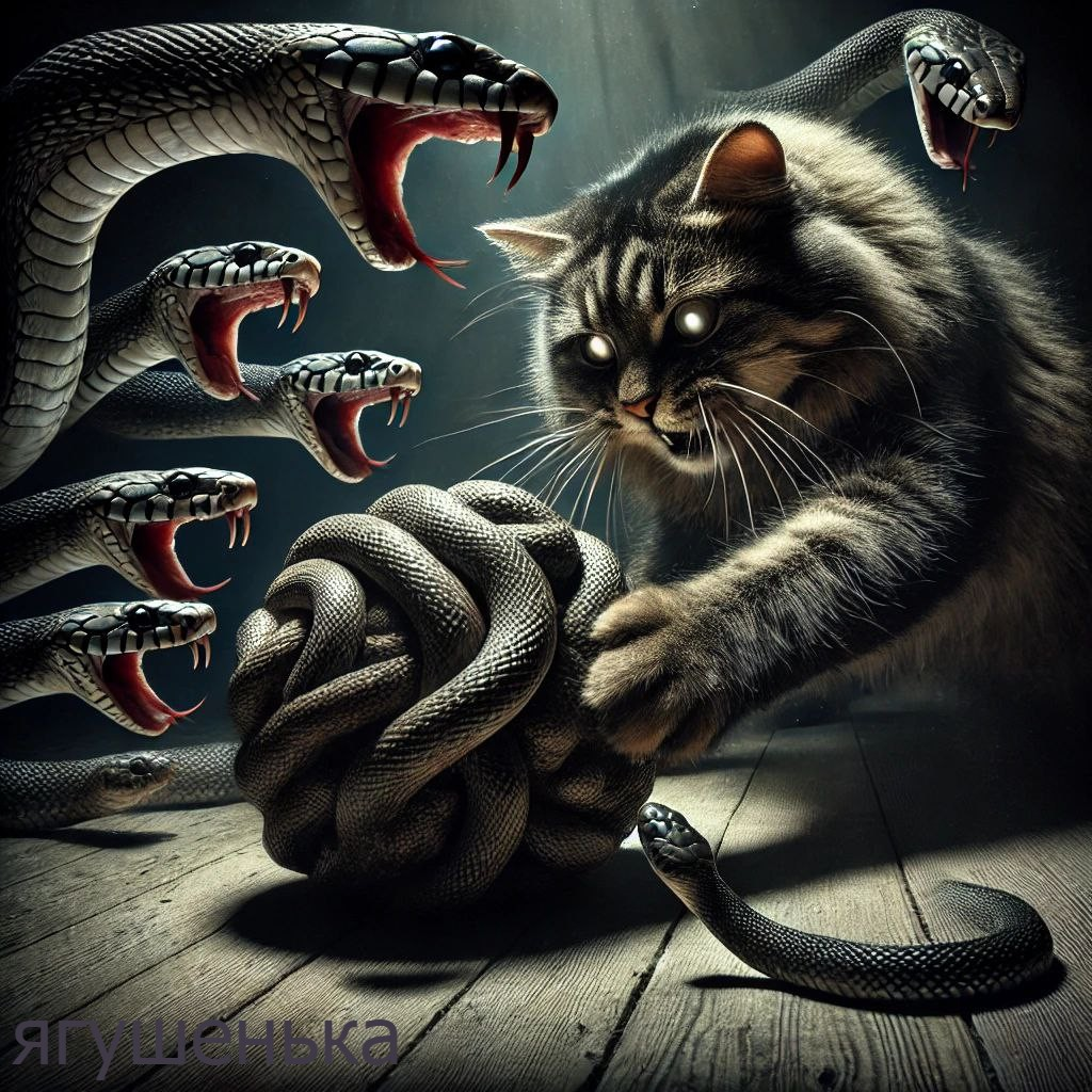 Поняв, что коту пофиг на укусы, Василиски спрыгнули с головы, перегруппировались и, превратившись в огромный шар, покатились на разъярённое животное.