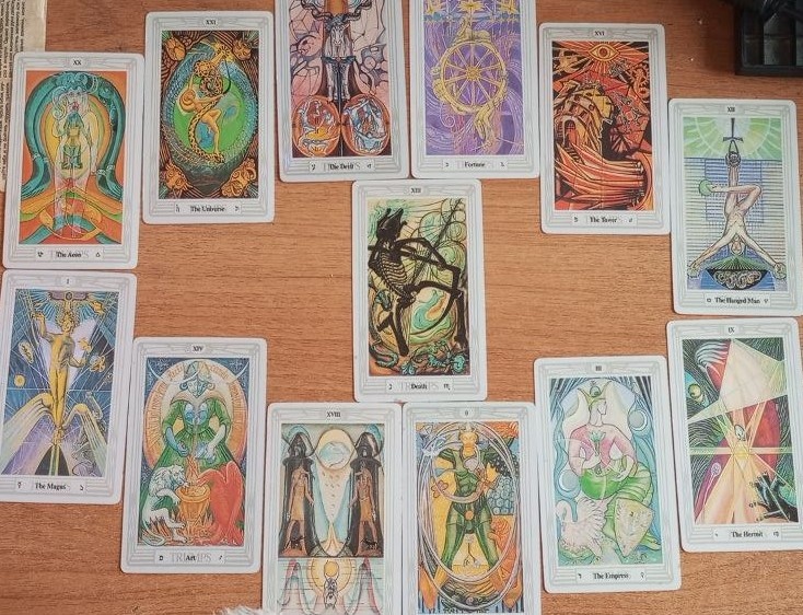 Так как это последнее Полнолуние года, в расклад взяла только старшие арканы колоды, тем самым подводя итог прожитого периода. Для каждого знака Зодиака использовала по одной карте и выложила их по схеме Колеса. 13-ый аркан лег в центр и определяет общую атмосферу периода.