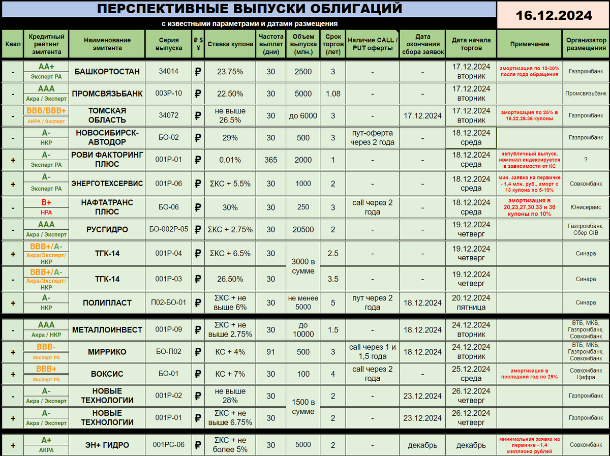 ОБЛИГАЦИОННЫЙ ВЕСТНИК 1️⃣6️⃣🔸1️⃣2️⃣🔸2️⃣0️⃣2️⃣4️⃣ ✌️ Добрый вечер, друзья! Признавайтесь, зачем все снова уронили? 😀 На самом деле лично у меня происходящее на рынке вызывает уже исключительно улыбку и глубочайший интерес. Ведь очень любопытно, чем все это безумие закончится. И самое главное в процессе - минимально поддаваться соблазнам, и максимально близко придерживаться выбранной лично стратегии. Всех денег все равно не заработать, а даже половина от этих "всех" куда лучше, чем ничего. Помочь разнообразить биржевой досуг помогут новости :) ---------- 🆕 НОВЫЕ РАЗМЕЩЕНИЯ / АНОНСЫ: ❄️ МЕТАЛЛОИНВЕСТ (🅰️🅰️🅰️) поможет разнообразить ассортимент высоконадежных бумаг с хорошей (на сегодня) премией. Выпуск 001Р-09, встречайте! Всего полтора года обращения, 5-10 миллиардов рублей объема, ежемесячные выплаты, ориентир купонной ставки - ΣКС + не выше 2.75%. Не все же одно РУСГИДРО набирать :) Сбор заявок состоится 18 декабря, а начало торгов должно случиться 24 декабря. ❄️ Выпуск эмит