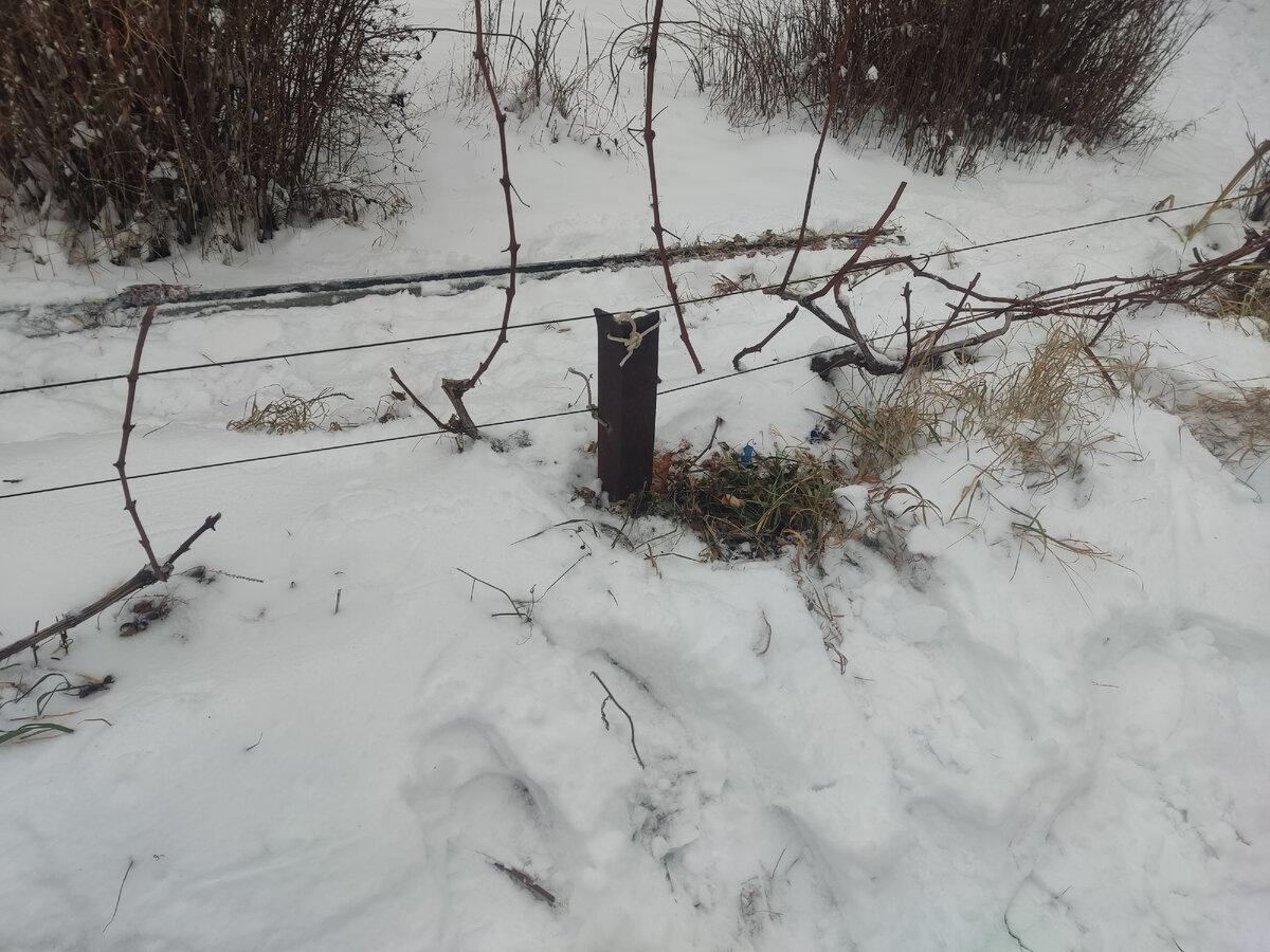 - Два слоя дорнита 300, перекинул через первую проволоку. У меня еще остались дуги из арматуры, с прошлых способов укрытий. Я ими на всякий случай защищаю зоны где после обрезки рукава выглядят наиболее "пушисто". В принципе можно и без дуг. Даже если от снега зимой проволока рвется, то как правило дорнит не ложится уже плотно на лозы, остается "горб".