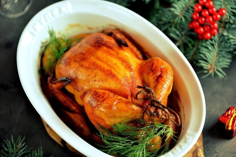 Подготовить и замариновать курицу легко, а вот запечь ее красивой и румяной — это дело техники и небольших секретов, которые я вам сегодня расскажу. Готовьте непременно, такое блюдо украсит любой праздничный стол, необязательно новогодний или рождественский. Ингредиенты на 4 персоны