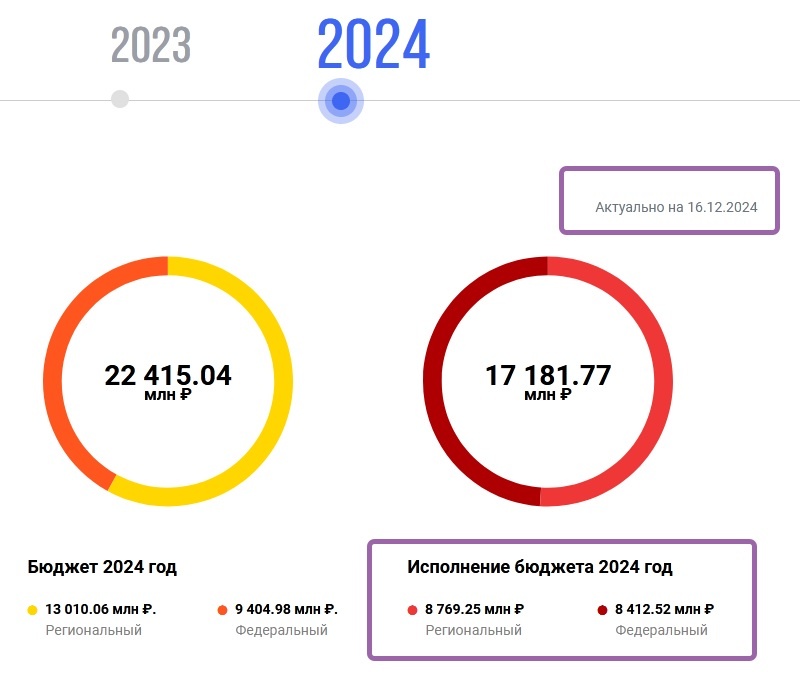 В 2022-м размер бюджета по нацпроектам был 28 млрд рублей, а реализован на 27,2 млрд. То есть, на 10 млрд рублей больше, чем к середине декабря 2024 года.