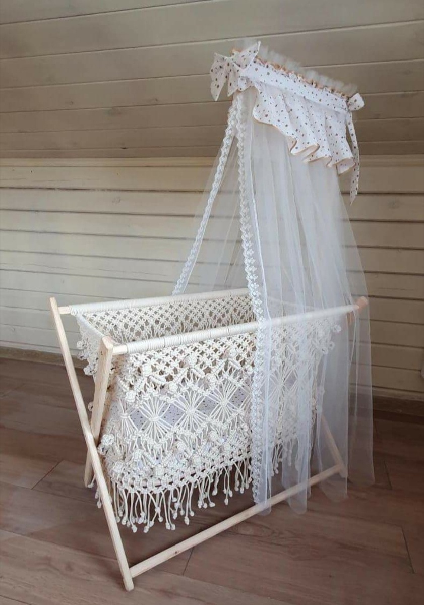 Дорогие друзья! Хочу поделиться с вами мастер-классом плетения детской колыбели в технике макраме. Размер спального места 42 на 82 см. Высота колыбели примерно 80 см. Вам понадобится 500 -600 метров шнура, 5 мм. Я использовала гамаковый шнур. Так же можно использовать хлопковый шнур лучше с сердечником, либо крученую верёвку. Нарезать нужно 112 отрезков по 4 метра, и 8 отрезков по 4,5 метра. Если захотите более богатую бахрому, то нужно отрезать на 30-50 см длиннее каждый отрезок. Так же вам понадобится каркас самой колыбели. Его можно изготовить из липы, осины, можно и из сосны. Так же и из любых других благородных пород, как дуб и ясень. Донышко из фанеры толщиной 10-15 мм. Также вы можете сделать держатель для балдахина и мобиля. Часть 1 Часть 2 Часть 3 Приятного просмотра. За подписку ❤