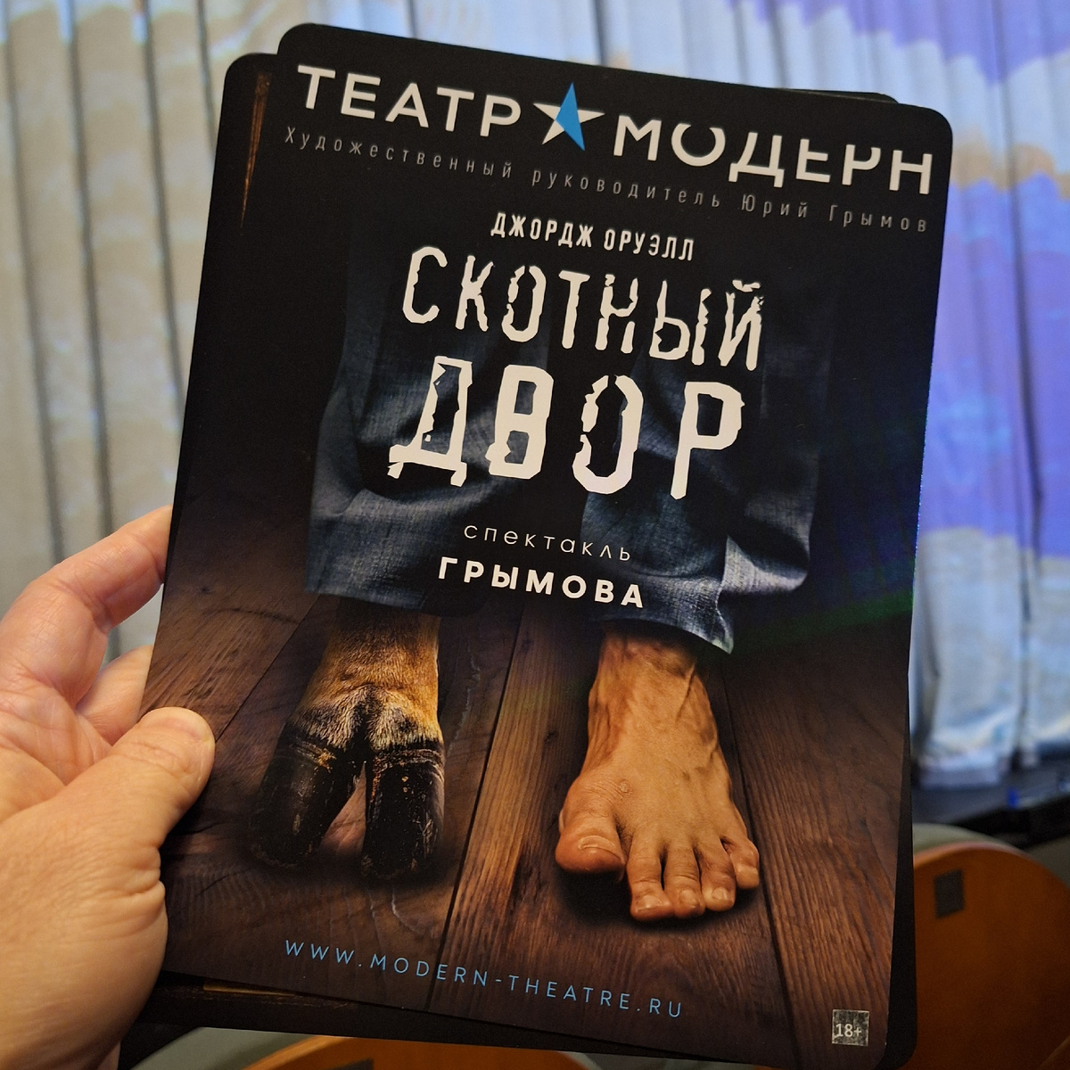 Наконец, и я добралась до октябрьской премьеры спектакля "Скотный двор" в Театре Модерн. Ещё в сентябре я была на открытой репетиции будущей премьеры, а летом прочитала одноименную повесть Джоржа Оруэлла. Так что эту постановку я очень ждала и хотелось увидеть как будут решены костюмы свиней и вообще всех животных. Для начала скажу, что бывать в новогоднем Модерне - это эстетическое удовольствие. Настроение Нового года чувствуется ещё на входе. Множество ёлочек, огонечков, подарочков и всякой новогодней атрибутики. Очень было мило, что все сотрудники театра были снабжены милыми рожками, что и понятно - мы на "Скотный двор" пришли! Даже на лестнице среди новогодних украшений сидела пара мимишных овечек) Все, что обещалось на репетиции режиссером спектакля Юрием Грымовым, было выполнено: никакой политической подоплёки (что, конечно, удивительно, ведь именно о Советском Союзе писал в своей повести Оруэлл) и действительно все страшнее. Если в нескольких словах описать спектакль, то я ск