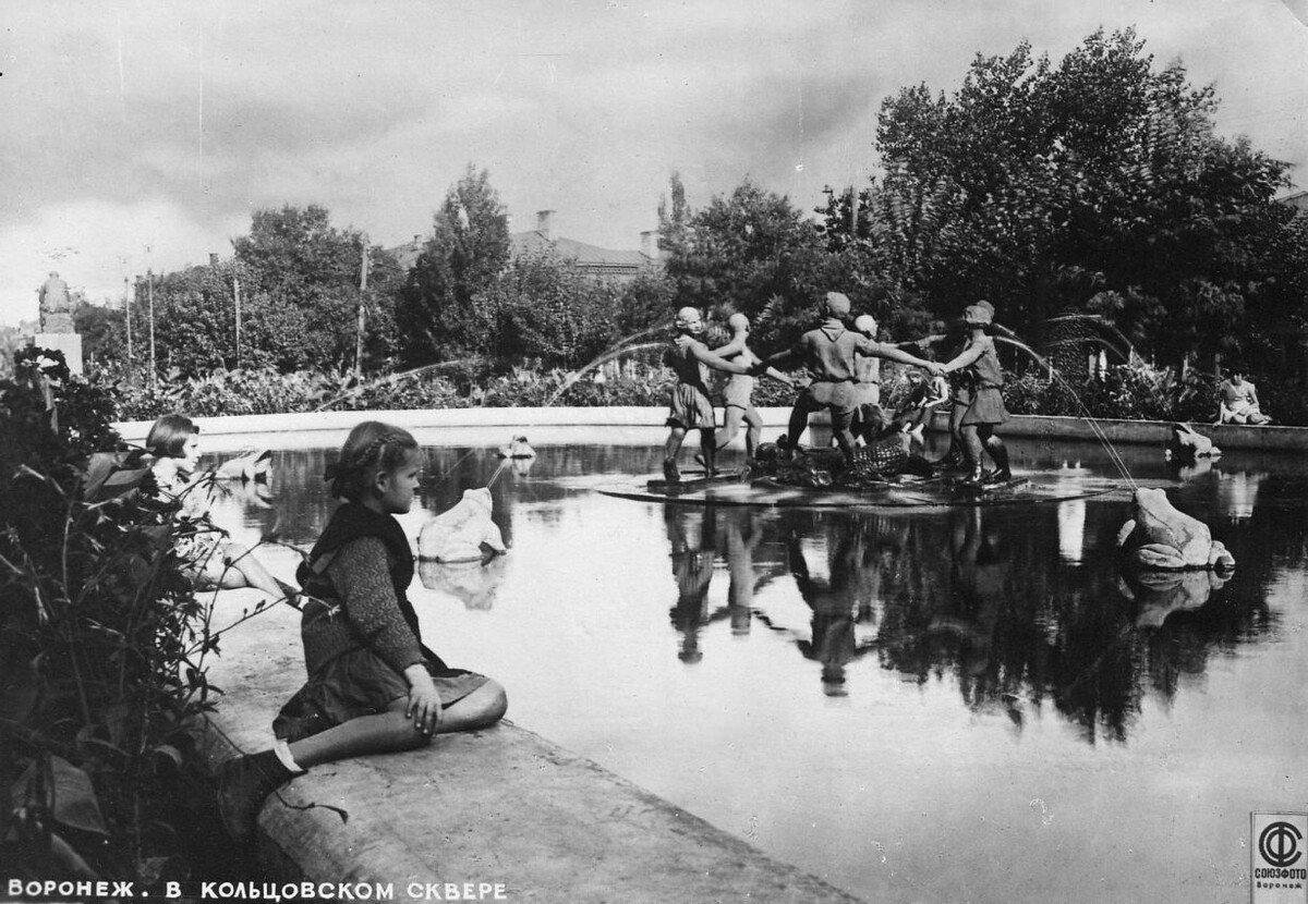 Самый первый вариант фонтана в Кольцовском сквере существенно отличался от нынешнего и представлял собой лишь одну струю. В 1977 году сквер, как собственно и фонтан, подвергся существенной реконструкции. После реконструкции фонтан теперь был с цветомузыкой. Кстати, реконструкция скверу потребовалась после того, как он был сильно разрушен в годы Великой Отечественной войны. Напомню, немцы в сквере устроили массовое захоронение своих солдат и офицеров. Да, реконструкция тянулась долго, но в послевоенное время было не до фонтанов, восстанавливали совсем иное в первую очередь. Кстати, насчет цветомузыки. В те годы аналогичные фонтаны были только в Воронеже, Сочи и Алма-Ате.