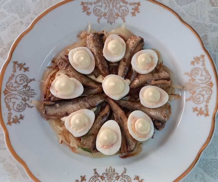 Простенький, но праздничный салатик. Выглядит нарядно и вкусный при этом. Шпроты же все любят? Ну вот. Ингридиента всего четыре: шпроты, лук, перепелиные яйца, майонез. Готовить просто и быстро. Лук нарезать перьями, поджарить до золотистого цвета. Разложить лук на тарелке На лук выдавить немного майонеза такими каплями. Не размазывать Шпроты выложить "звездочкой" Вареные перепелиные яйца разрезать на половинки и разложить их между шпротинами. На каждое яичко капнуть майонез Готово! Зовите едоков!