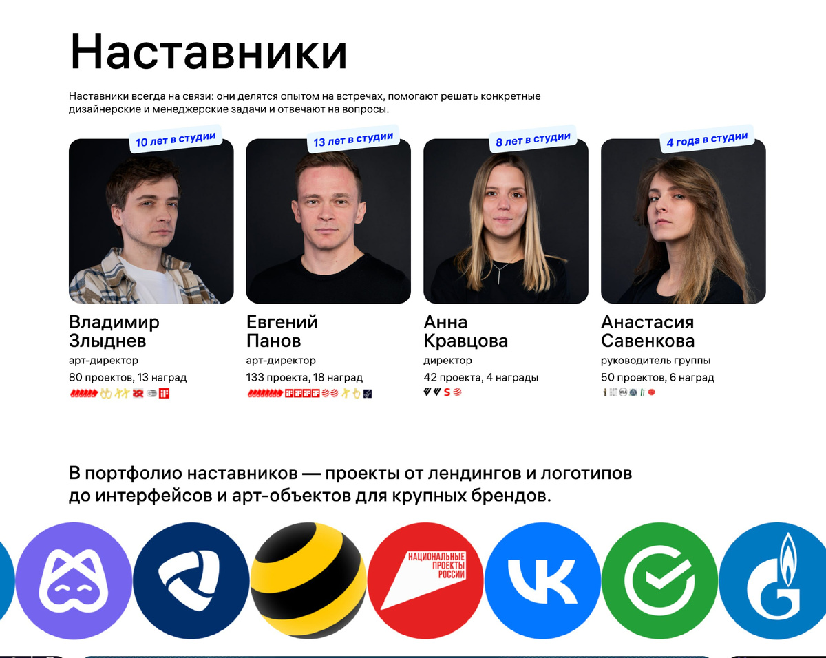 В первом наборе ждем граф- и веб-дизайнеров, а также менеджеров. Программа строится вокруг работы над проектом: участники разбиваются на команды, каждая создает свой проект — логотип, сайт, лендинг или мобильное приложение.