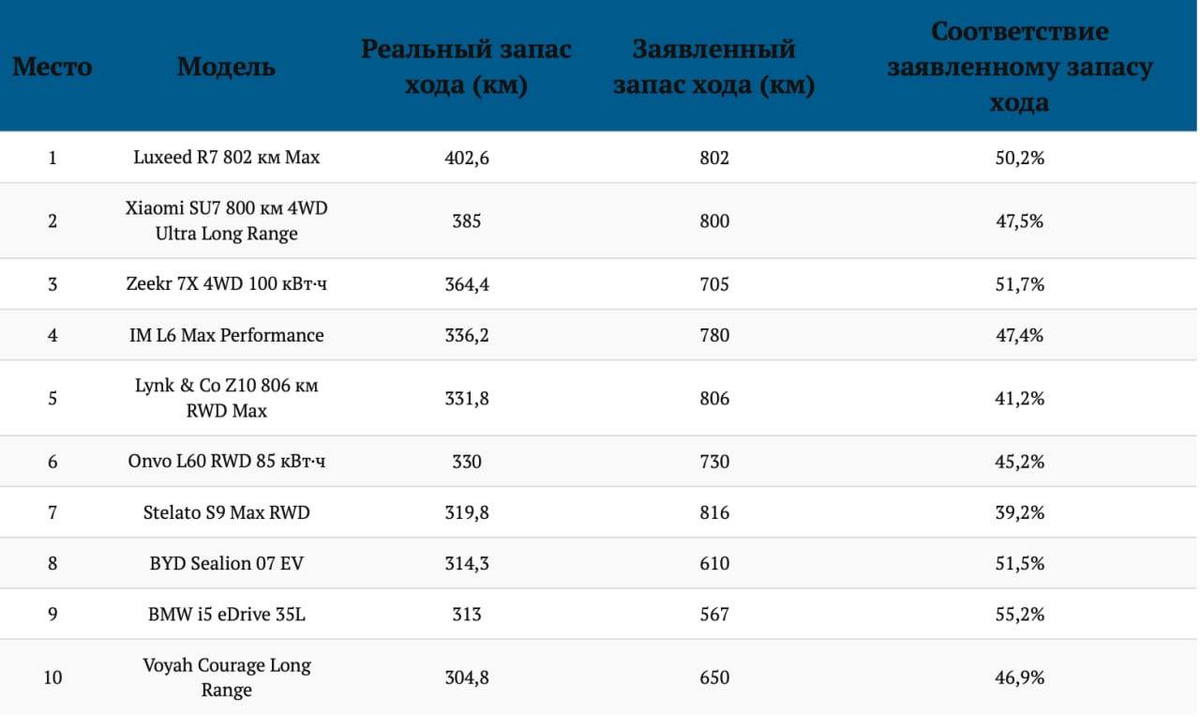 Более 50 электромобилей и гибридов в условиях Внутренней Монголии (температура от -15 до -25°C), имитируя реальные условия эксплуатации. Лучшими электрокарами по фактическому пробегу на одном заряде стали • Luxeed R7 (402,6 км из заявленных 802 км), • Xiaomi SU7 (385 км из 800 км) • Zeekr 7X (364,4 км из 705 км). Среди гибридов лидировали • Lixiang L9 Ultra (164,7 км из 280 км), • Avatr 12 Ultra RWD (150 км из 245 км) • Avatr 07 Max RWD (137 км из 230 км).