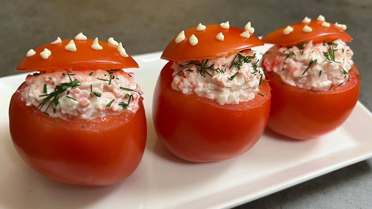 Новый Год с яркой закуской из помидоров и крабовых палочек! Эта яркая, оригинальная, красивая и очень вкусная закуска украсит Ваш праздничный Новогодний стол. Готовится закуска очень быстро, но вкусно просто не реально! Срезаю шляпки у томатов. С помощью столовой ложки аккуратно удаляю мякоть, стараясь не повредить целостность плодов. Мякоть я не выбрасываю, расскажу позже, как я делаю быстрый перекус. Крабовые палочки нарезаю мелким кубиком. Добавляю творожный сыр и перемешиваю до однородной массы. Наполняю помидорные чашечки начинкой. Посыпаю немного укропом. Накрываю шляпками. И украшаю "точками" майонеза. Эта вкусная, пикантная и эффектная закуска очень красиво смотрится на праздничном столе! Ломтики хлеба поджариваю на сухой сковороде. Натираю долькой чеснока. Поливаю немного оливковым маслом. Сверху кладу мякоть помидоров. И посыпаю морской солью. Это очень вкусный быстрый перекус и можно приступать опять готовке, ведь скоро Новый год! Перекус: