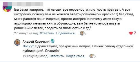 Вы сами говорите, что на свитере неровности, плотность прыгает. А вот интересно, почему вам не хочется вязать ровненько и красиво?) без обид, мне нравятся ваши изделия, просто интересно почему имея такую аудиторию, печатая книги обучающие, вам бы не хотелось вязать ровненькие петли, следить за плотностью и тд?