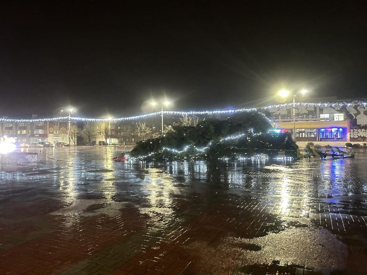 Новогоднюю елку на площади Ленина в Калинковичах 16 декабря повалил сильный шквалистый ветер.