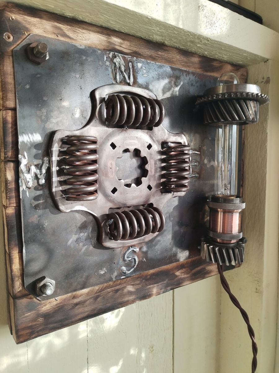 Дизель-панк - это стиль, который сочетает элементы стимпанка, киберпанка и индустриальной эстетики, создавая уникальный визуальный эффект. Светильник в стиле дизель-панк — это яркий элемент декора, который привносит атмосферу урбанистической фантастики и пост-апокалипсиса в интерьер. Вот несколько причин, почему такой светильник может быть полезен в интерьере: 1. Создание атмосферы Светильник в стиле дизель-панк добавляет интерьеру особый шарм и характер. Он создает ощущение погруженности в альтернативную реальность, где технологии и механика переплетаются с элементами прошлого и будущего. Независимо где вы хотите создать такую атмосферу: дома, на работе или баре 2. Акцентирование внимания Такой светильник становится центральным элементом комнаты, притягивая взгляд и задавая тон всему пространству. Он идеально подходит для того, чтобы подчеркнуть индивидуальность владельца и его вкус. 3. Освещение пространства Помимо декоративной функции, светильник также выполняет свою основную з