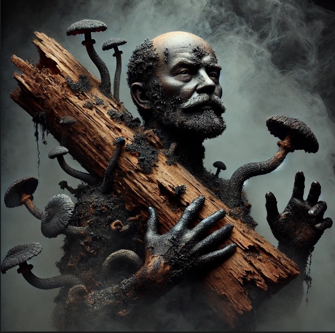 Туман, густой и холодный, как дыхание мертвеца, стелился над Смольным. Он проникал в саму суть вещей, в щели между досками, в трещины замерзшей земли. В этом тумане, подобно призраку, блуждал образ: лысый человек с усами, щурящий глаза, сжимающий в костлявой руке бревно. Это было бревно не простое. Это был ключ. Его звали Владимир Ильич. Или, точнее, это было тело, в которое вселился он. Он. Кордицепс. Не простой гриб, а нечто невообразимо большее. Его мицелий, тончайшая сеть гиф, пронизывала это бревно, словно призрачные нервы, питая хозяина, даруя ему силу и волю. Владимир Ильич был марионеткой, и хотя он думал, что рулит историей, рулил им Кордицепс. Он видел всё через глаза Владимира Ильича, чувствовал все его чувства, переживал все его триумфы и поражения. Он упивался властью, он строил свои грибные империи, он раскидывал споры своими декретами и решениями. Но его сила была привязана к бревну. К этой темной, холодной святыне в его одержимых руках. Без бревна он был ничто. Просто с